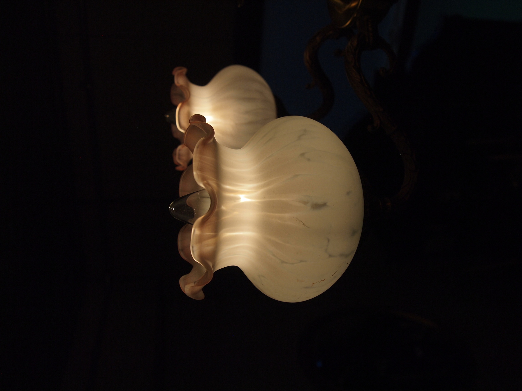 縁が淡い赤紫色をしたガラスシェイドが付く、天井直付け5灯シャンデリアです。