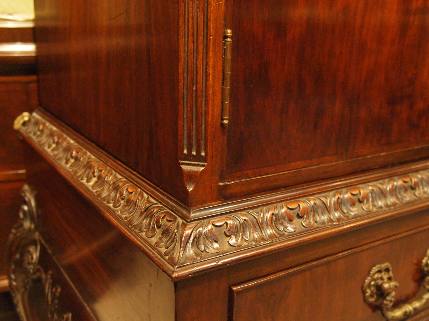 ライオンパウなど全体を飾る彫刻も然ることながら、マホガニーの無垢板に木目を揃えたマホガニーの化粧が施された美しい食器棚です。