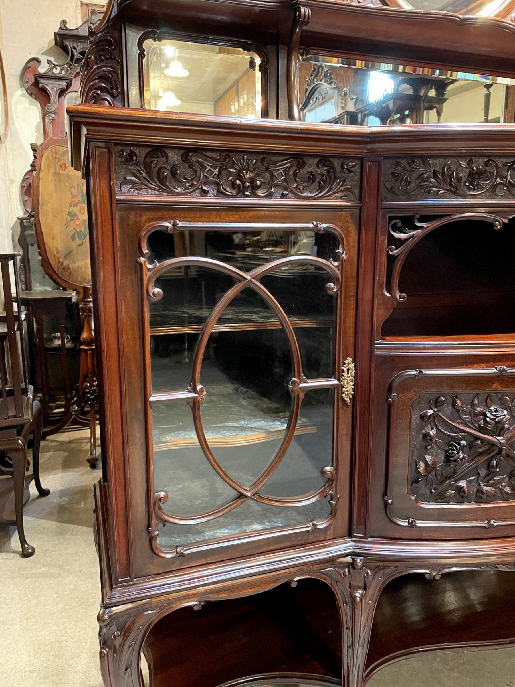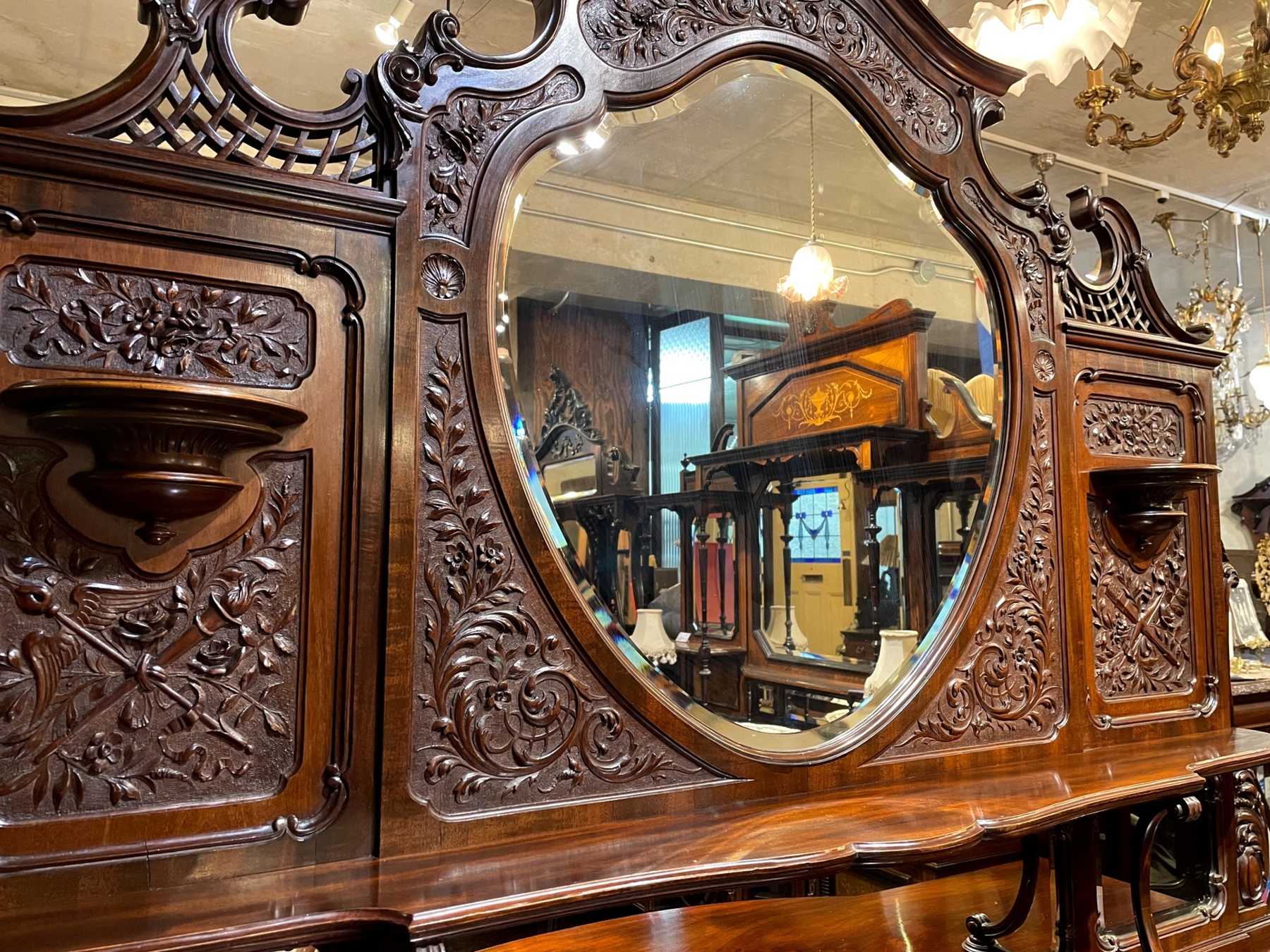 盾形の面取り鏡や全体に施された繊細な彫刻も然ることながら、脚元の背面装飾や背板にもマホガニーの無垢材が使われた逸品です。