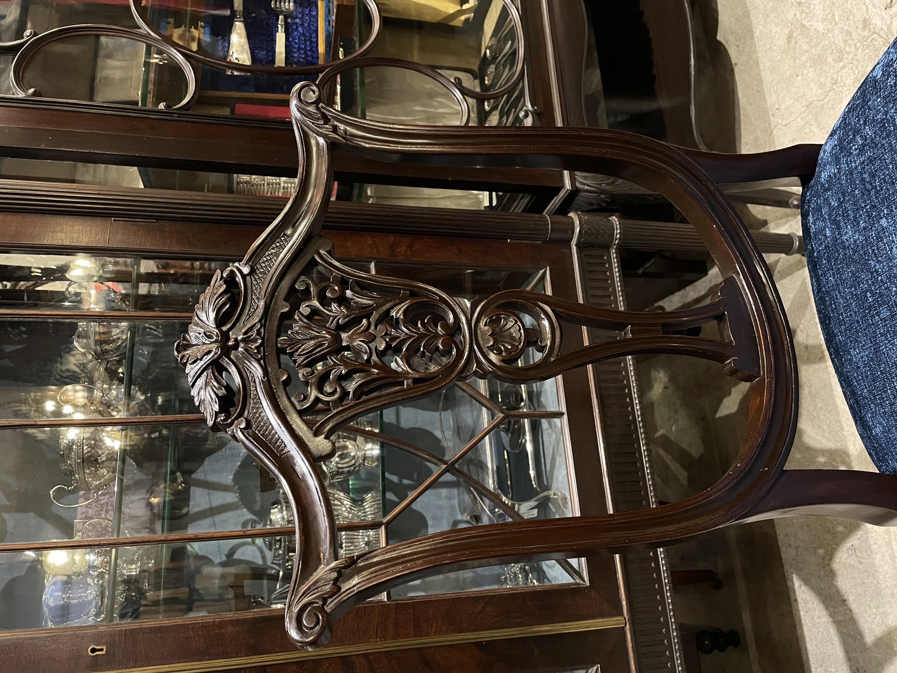 盾形の背もたれに繊細な彫刻が施された、シルエットの美しい椅子です。
