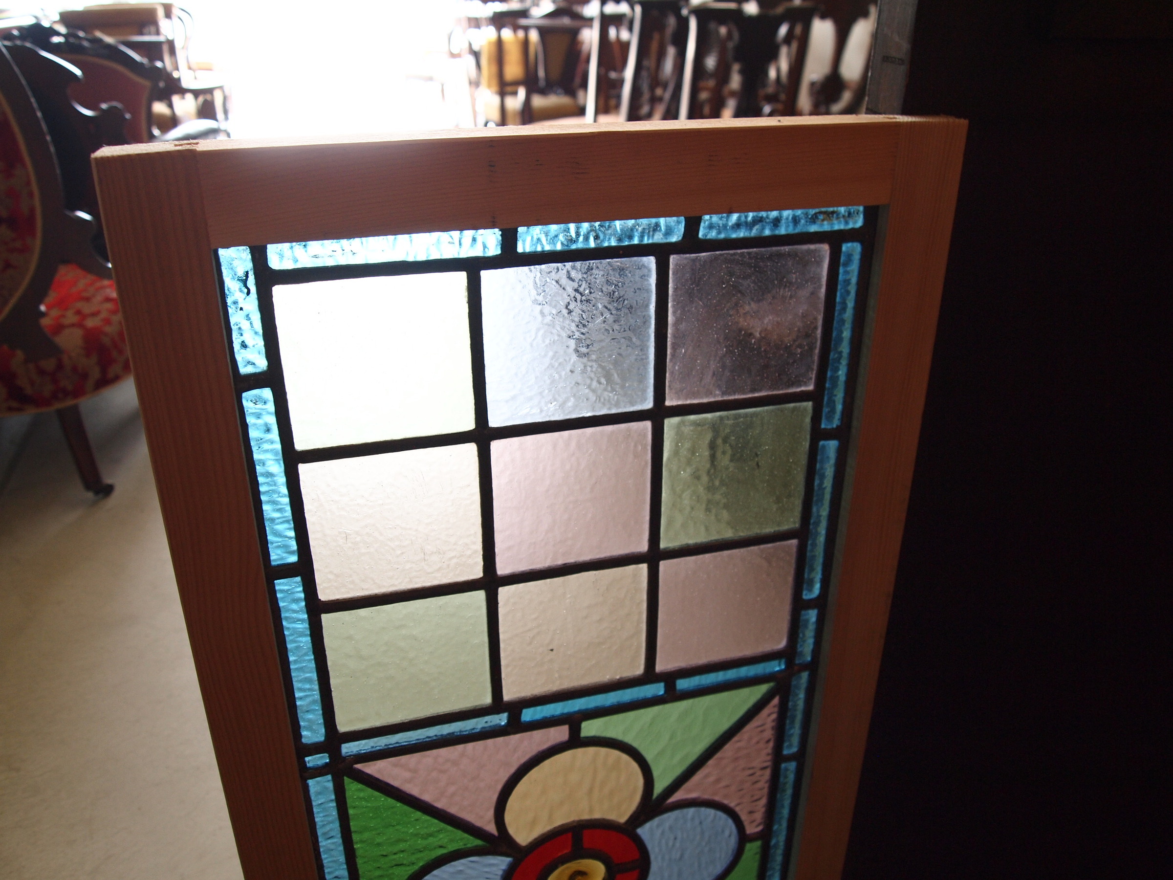 中央に琥珀色のロンデルが配置され、淡い色ガラスで構成された1枚です。