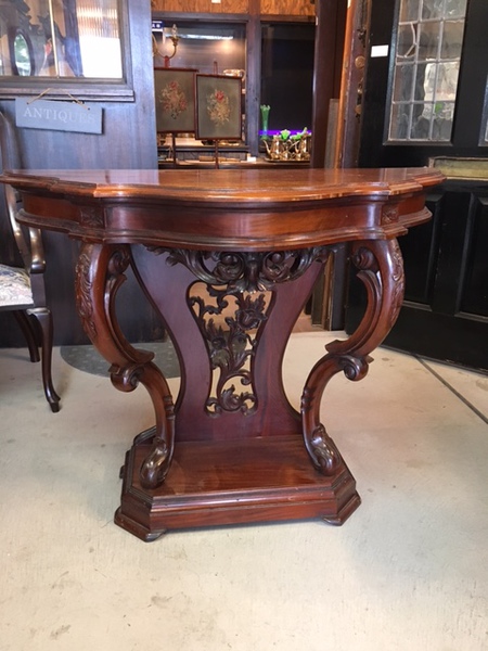 無垢のマホガニー材が贅沢に使われ、美しい彫刻が施されたコンソールテーブルです。
