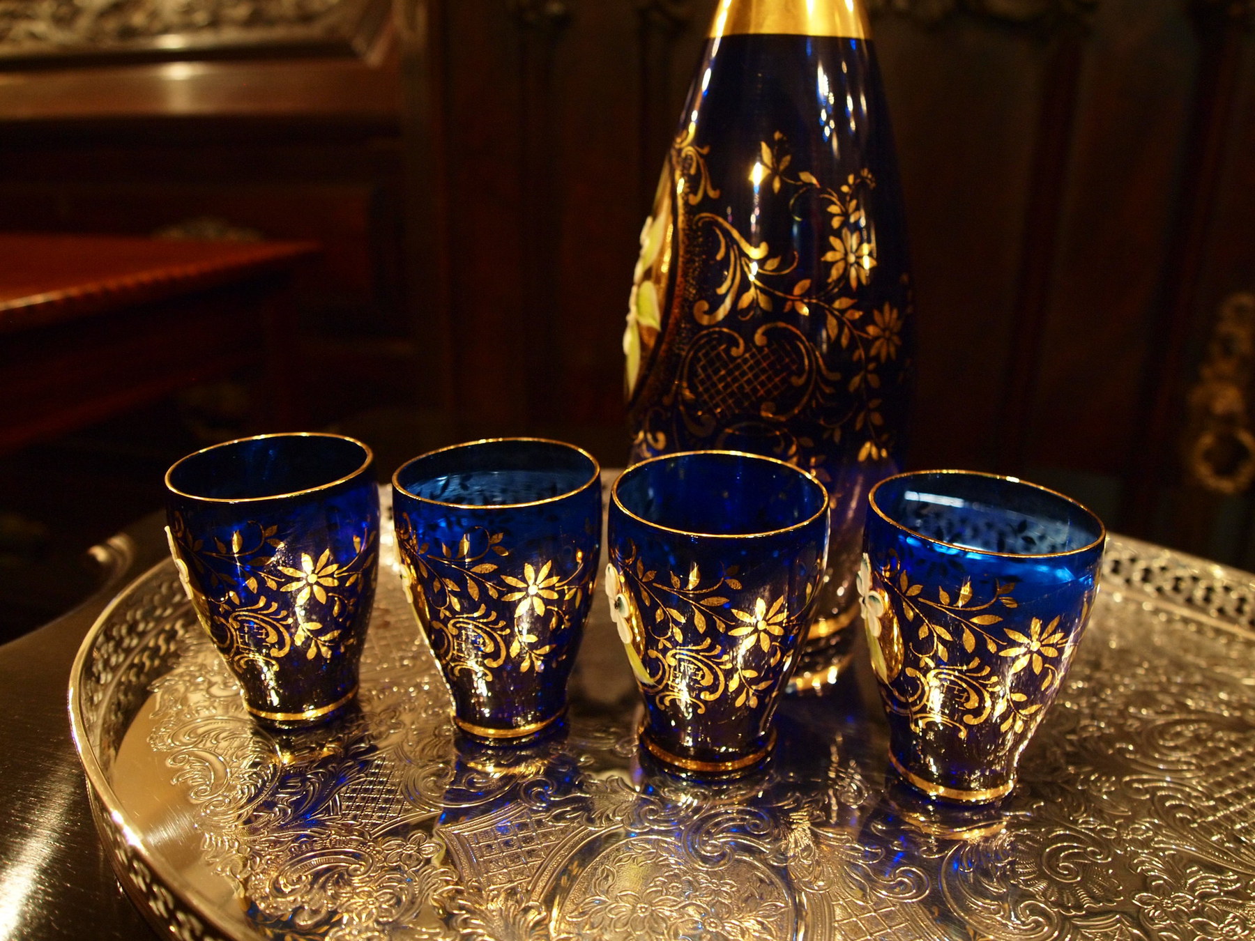 瑠璃色のガラスに金彩が施された19世紀後期のデキャンタ&グラスセットです。