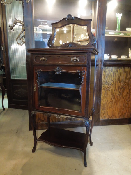 飾りのミラーは経年による銀引き面に酸化の曇りが一部見受けられますが、扉に入ります透明のガラス含め当時のオリジナルとなっております。