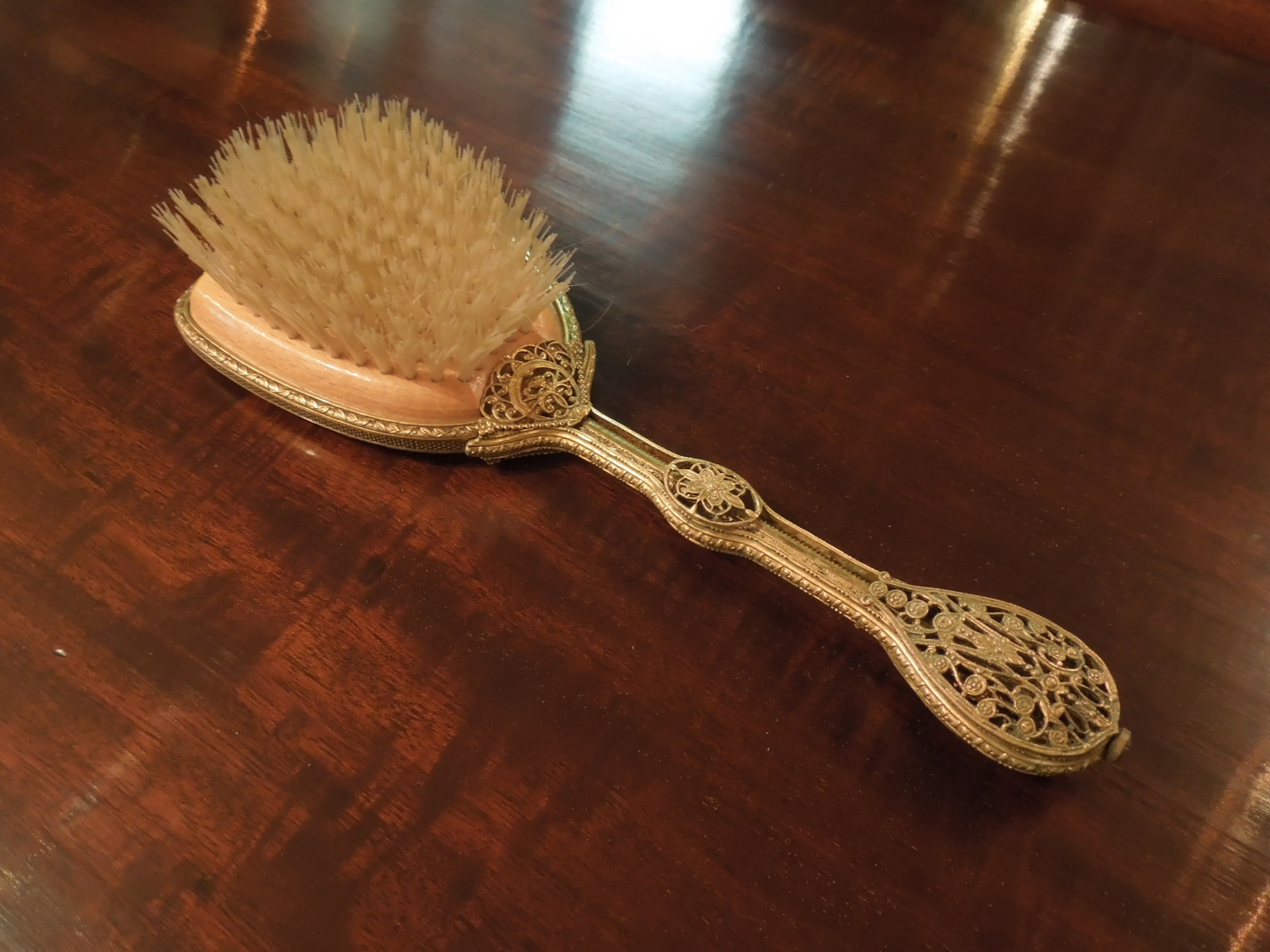 美しいプチポワン(刺繍)があしらわれた、取っ手が真鍮製のブラシです。