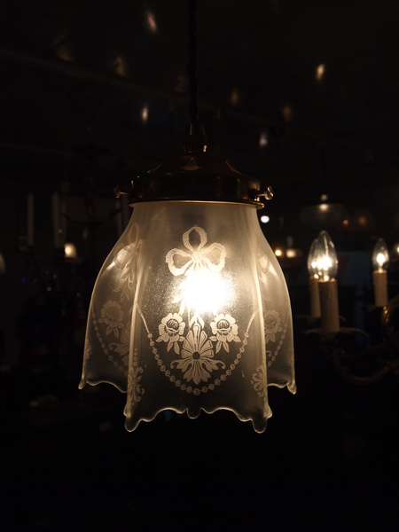 リボンと花があしらわれた、元はガスランプに使われていたガラスシェイドです。
