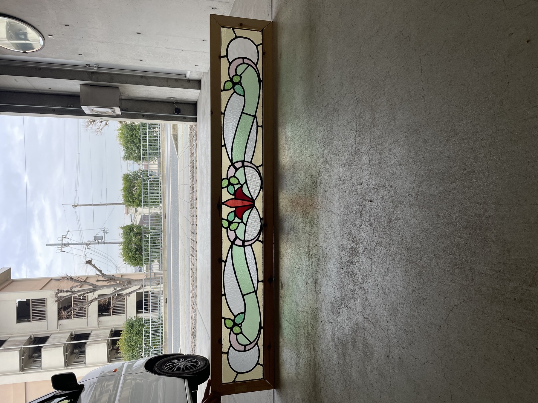 元はトランサムウィンドウとして使われていた、吹きガラスで焼かれた赤い花が印象的な横長の一枚です。