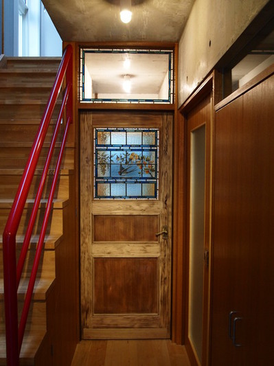 ドアの上部に入る擦りガラスも、背景が少し揺らめいて見える透明度の高いガラスに交換することで空間に広がりが出ました。