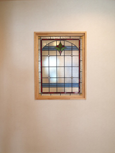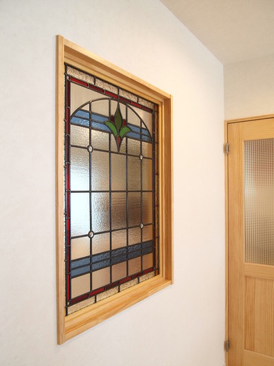 この度、竣工してまだ間もないこだわりの詰まったお住まいに、リサイズ加工を施したアンティークステンドグラスをお納めいたしました。 ステンドグラスを挟み手前と奥の空間がいずれも開放的な明るい壁面への設置でしたので、どちらからご覧になっても美しい窓になりました。 屋内に入ると直ぐに見える位置でもありますので、ご家族の皆様はもちろん、お越しになるお客様にもお愉しみいただける窓が完成いたしました。