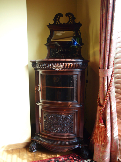 この度、それぞれのお部屋を彩るサイズ感の良いアンティークスをお納めいたしました。 明るい陽が射し込む客間には全体に美しい彫刻が入るビクトリアンキャビネットを配置し、お持ちのコレクションなどを収納していただきます。 制作したガラストップと共にお納めしたオーバルのワインテーブルには、四季折々の花を飾り和室でお使いいただきます。 モリスの壁紙が目を惹くお部屋には、繊細な作りのビューローブックケースとそれに合わせたインレイドチェアを設置いたしました。 座面生地の独特の色が壁紙の中に使われている色味と合い、また窓下の空間にぴったりと収まりました。 これからも大切にお使いいただきます。