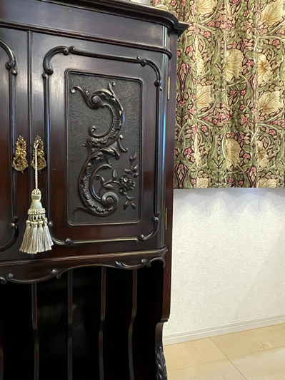 この度、ビクトリア時代後期に制作されたミュージックキャビネットをお納めいたしました。 棚板や仕切り板はもちろんのこと背板にもマホガニーの無垢板が使われ、後脚にも前脚と同じ彫刻が施されておりますので、どの角度からご覧になっても絵になります。 また、観音開きの扉に彫られたモチーフは、窓を彩るカーテンと柄の繋がりも感じられ、細部の作りと共に19世紀の意匠もお愉しみくださいます。 同じ空間に並ぶお持ちの家具たちとの相性も良く、美しく収まりました。 これからも大切にお使いいただきます。